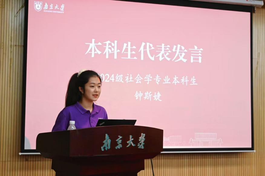 本科生代表、2024级社会学专业钟斯婕同学分享了自己选择社会学的心路历程。她的所思所感,也同样是每位社院人的缩影:因为热爱、因为求知,社院人在对社会问题和社会结构的探求中寻找自我的意义;因为理想、因为情怀,社院人在回应时代发问、把握现实困境的尝试中寻觅人生的价值。