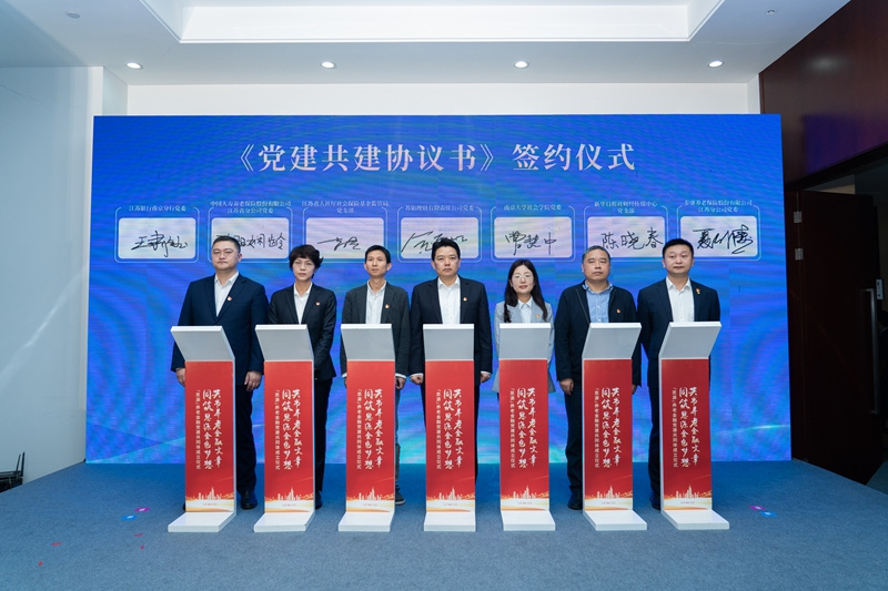 苏银理财有限责任公司、太阳成集团tyc、江苏省人社厅社会保险基金监管局、新华日报社财经传媒中心、中国人寿养老保险股份有限公司江苏省分公司、泰康养老保险股份有限公司江苏分公司、江苏银行南京分行七家成员单位代表上台签署《党建共同体共建协议书》。