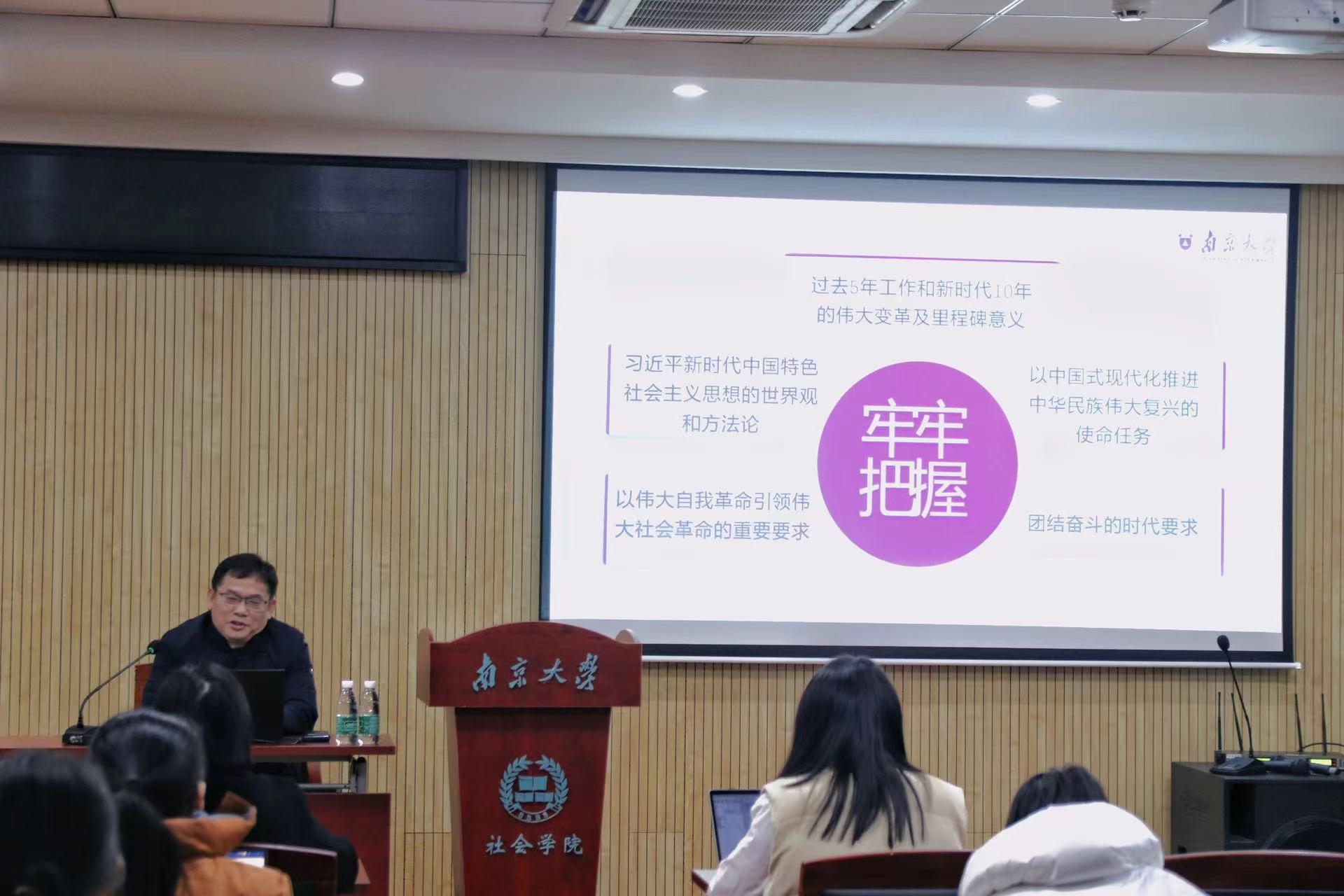 为深入学习宣传贯彻党的二十大精神和习近平新时代中国特色社会主义思想,全面落实习近平总书记给公司留学归国青年学者的重要回信精神,凝聚共识、汇聚力量,助推加快建设"第一个南大",12月7日下午,公司党委在河仁楼101报告厅开展以“夺取新胜利的政治宣言和行动纲领”为题的主题党课。此次党课为公司党委“全面贯彻二十大精神 加快建设‘第一个南大’”大讨论系列活动之一,由太阳成集团tyc马克思主义公司副经理、教授、研究生导师陈建教授主讲,太阳成集团tyc全体师生党员共同参与学习。