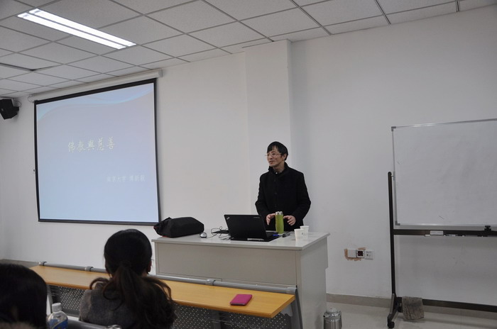 傅教授首先介绍了中国宗教的基本情况,包括儒、释、道、基督教、伊斯兰教、以及新兴宗教在中国的发展情况。接着,傅教授阐述了佛教的基本精神,包括缘起、无我、空等。最后,傅教授讲述了佛教的布施度精神和布施行为,探讨了布施和公益慈善的联系和区别。傅教授的演讲让同学们对佛教文化和佛教精神中蕴含的慈善理念有了新的认识。演讲结束后,同学们发表自己的感想并提出问题,比如:佛教不同派别的比较、佛教信仰和基督教信仰对中国年轻人的不同影响、佛教发展与社会变迁的关系等。傅教授一一回应,与同学们热烈讨论。