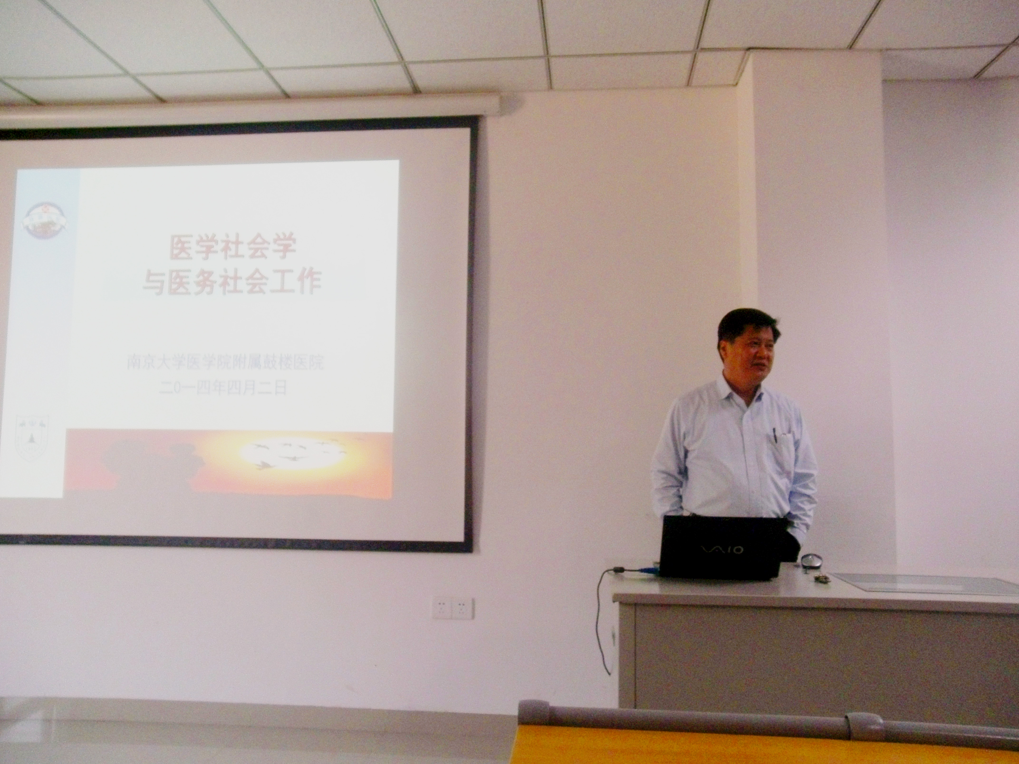2014年4月2日下午两点,在太阳成集团tyc河仁楼119室,太阳成集团tyc医公司附属鼓楼医院副经理韩光曙应邀为2013级MSW全体员工开展社会工作实务研讨课,由田蓉老师作为主持。