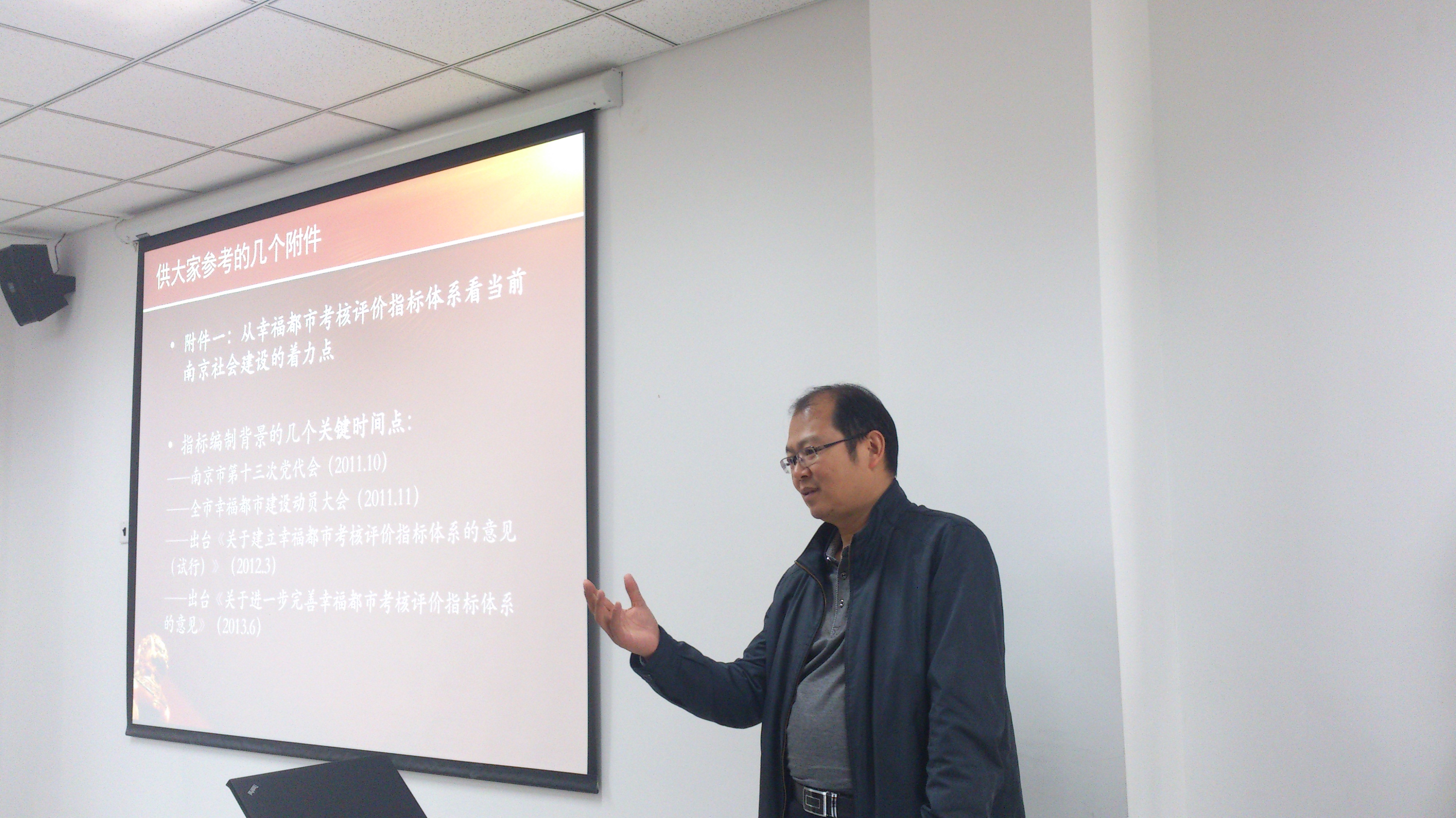 在谈到当前南京社会建设面临的形势和问题时,他从政府和社会两个角度来阐述:从政府角度看,认知有待进一步提升、改革有待进一步推进、政策有待进一步完善;从社会角度看,社会需求更加多样、社会问题更加复杂、社会协同能力不足。为了进一步阐释幸福都市的理念,许主任列举了“幸福都市的指标内容”以及2013年全市指标测评得分情况,更直观的展示了南京目前的社会建设情况。