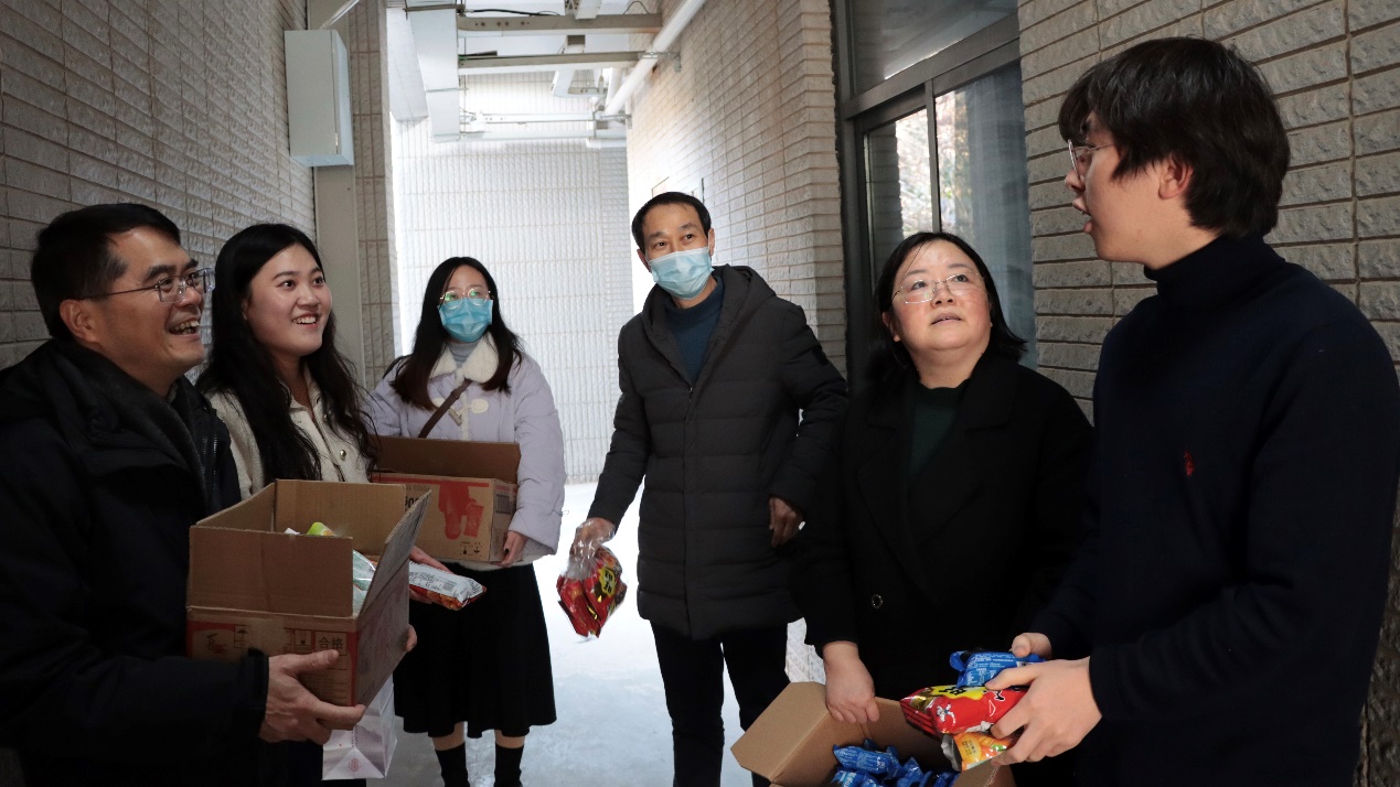 从员工中来,到员工中去。为加强师生联系,关心员工学习生活,公司党委书记王建富、党委副书记沈晖、副经理吴愈晓、本科生辅导员刘艺、研究生辅导员邵晓宁于1月5日下午走进仙林校区本科生宿舍,为同学们送上了贴心的备考礼包和暖心的祝福。
